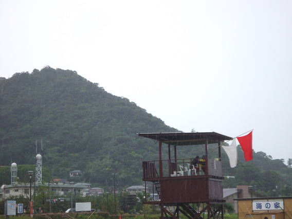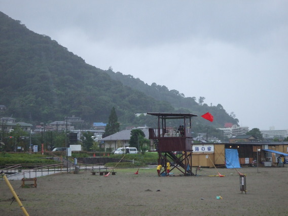 赤旗は遊泳禁止です。 赤旗と白旗が両方出ていたら遊泳注意です。 先ほどまで雷が近づいていたので赤旗でした。(10時30分から11時頃) 現在は(11時15分)赤旗と白旗ですので遊泳注意です。 海はたいへん、穏やかです。