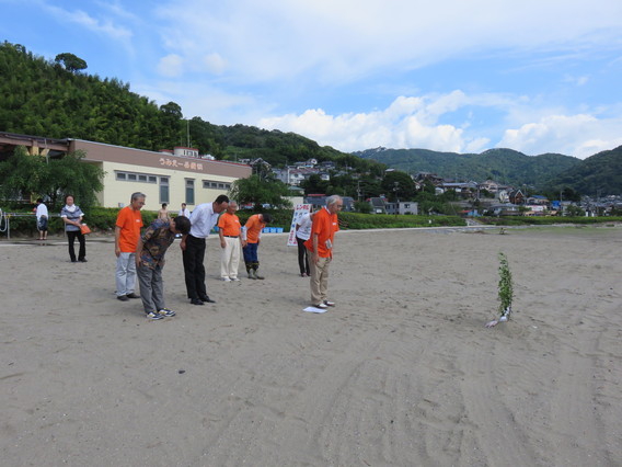 平成26年7月12日(土)午前9時より、恒例となっている海開き式を行いました。市内では唯一長浜ビーチで実施されているものです。式は地元下多賀神社の氏子であり、本協会の副会長である中島さんの司会進行により厳粛に行われました。まず、中島副会長の祝詞奏上に続き、富岡篤美協会長、山田哲也料飲組合長、秋山忠治商業組合長、越村修市議会議員が玉串を上げ、全員で2礼2拍手1礼を行いました。最後に富岡会長から海の安全、事業の進展、暑さに向け体に注意してがんばろうと挨拶がされました。
