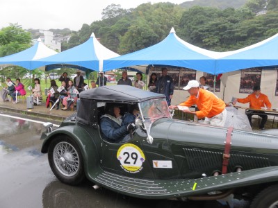 参加車は基本オープンカーなので、ホロをかっぶたものと、カッパを着て、濡れ鼠で走ってくるものも。また、腹に響くような独特のエンジン音が時代を感じさせます。