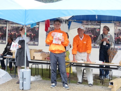 また、9時過ぎた時点で、伊東のマリンタウンをオフィシャル・カーが発車したとのことで、雨の中、早めに来て頂いた越村議員やラ・フェスタのスッタフさんにも手伝ったもらい、テント2幕を急遽設営。受付用のテーブルや「旗」、「チラシ」の運び込み、吹き込み対策用に横幕をテントに設置し、ポスターを張り終わったころ、オフィシャル・カーが長浜入り。セーフ!